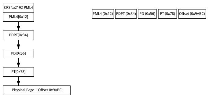 PML4 index, PDPT index, PD index, PT index, and the page offset. Each of