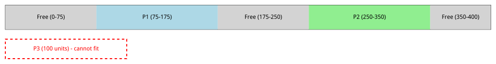 Segmentation offers a flexible way to place programs in memory. Each program can start at an arbitrary physical address defined by its segment base. However, this flexibility introduces a serious problem. Imagine we have 400 physical memory units and want to run four programs, each requiring 100 units. The first program is placed at addresses 75–175 and the second at 250–350. Now, we want to load the third program, which also needs 100 memory units. Despite having 200 units of free memory (from 0–75, 175–250, and 350–400), no contiguous block of 100 units is available. As a result, the third program cannot be loaded unless we stop execution and move other programs around to defragment the memory.